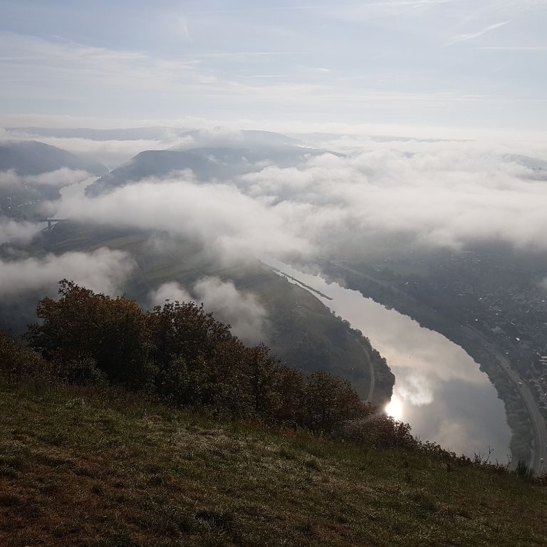Vom Landeplatz die B49 überqueren und auf dem Feldweg parallel Richtung Eisenbahnbrücke laufen. Kurz vor der Brücke in den Wanderweg einbiegen. Immer der Beschilderung des Moselsteigs folgen. Dieser kommt am Startplatz vorbei. Nicht den Klettersteig nehmen.
